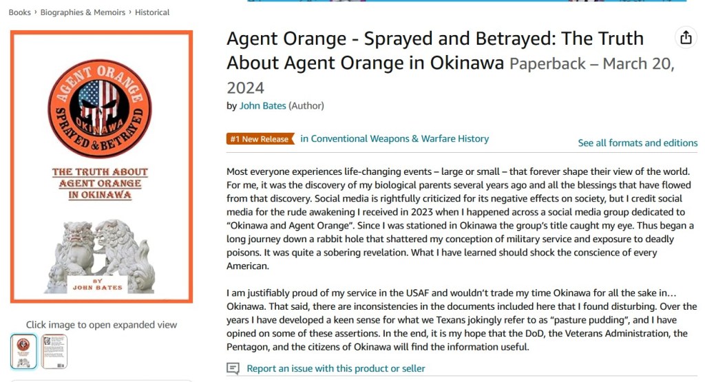 I intend to expose the DOD, the Pentagon, Congress, and other obstructionist entities about Rainbow herbicides involving Okinawa (the transport, storage, use, burial & disposal)… facts AND their outright lies about “all of the above”. Also, I’ll confer with the Japanese & Okinawa Counselates about the presence of these deadly chemicals that I know of (am aware of / was involved in 1968,69 & 70) I’m anticipating help from Wounded Warriors.Org (I’ll post more info as it becomes available). Good book John”